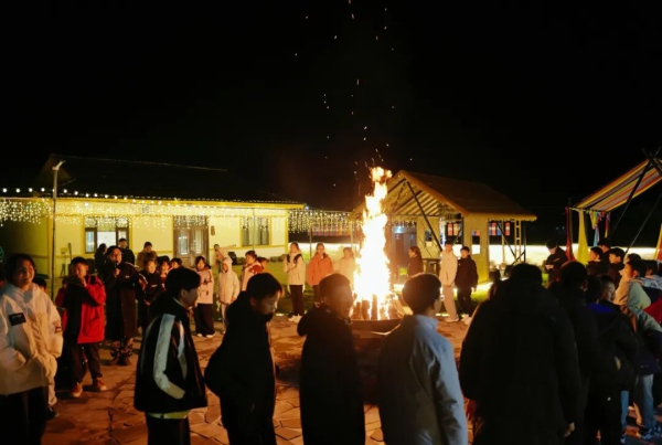 随着夜幕降临,篝火升起,一场热闹的“篝火晚会”点燃了全场的热情,各族青少年手拉手围绕篝火翩翩起舞,唱起悠扬的《红太阳照边疆》歌曲。随后开展的“不倒森林”趣味小游戏,考验着大家的默契与协作——每个人手持一根塑料杆,在保持杆直立的同时,与相邻的人交换位置,共同维持“森林”不倒。游戏过程中,大家相互鼓励、及时调整,在一次次尝试中逐渐找到技巧,不仅收获了快乐,更体会到团结协作的重要性。