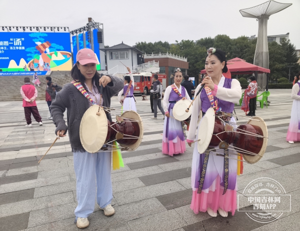 如果说美食满足了味蕾,那么同步展开的非遗体验则是一场全方位的文化洗礼。原汁原味的朝鲜族刀舞刚劲有力,典雅的长鼓舞韵味悠长。令人惊喜的是,游客们不再只是场下的鼓掌者。在非遗代表性传承人的指导下,他们兴致勃勃地走上台前,亲手尝试转动精巧的刀舞道具,学习简单的长鼓节奏。