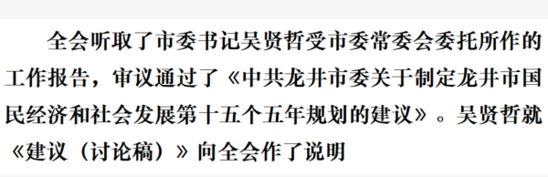 全会以习近平新时代中国特色社会主义思想为指导,深入学习贯彻党的二十届四中全会精神,认真落实省委十二届八次全会和州委十二届十次全会精神,听取了吴贤哲受市委常委会委托所作的工作报告,审议通过了《中共龙井市委关于制定龙井市国民经济和社会发展第十五个五年规划的建议》。吴贤哲就《建议(讨论稿)》向全会作了说明。