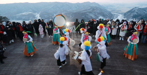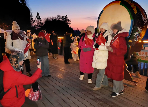 新年第一天的旅程从观日光山曙光开始。清晨6时30分,游客从老虎岭出发,沿“福满门”打卡点拾级而上,登顶日光山主峰观景平台共迎新年曙光,定格“日出图们”的壮丽瞬间。随后,在农乐表演的悠扬旋律中祈愿国泰民安、生活美满。8时整,新国门广场举行庄严的升国旗仪式,全体人员肃立高唱国歌,齐诵《歌唱祖国》,现场还赠送了文旅宣传手册与手写福字,让爱国情、民族情在边疆国门交融升华。