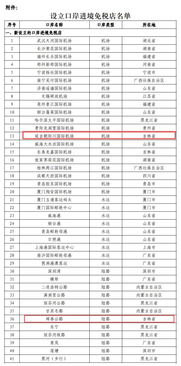 1月21日,财政部等五部门对外发布,将在全国41个口岸各新设1家口岸进境免税店,其中延边获批新设2家,分别位于延吉朝阳川国际机场和珲春公路。