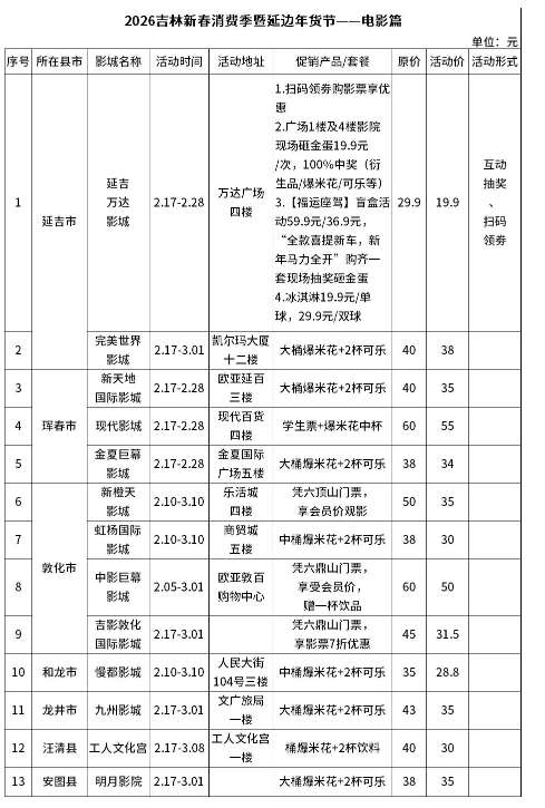 此次活动作为“2026吉林新春消费季暨延边年货节”的重要组成部分,不仅有人均近百元的新春观影补贴,还涵盖观影与餐饮立减套餐,诚意满满,陪你热热闹闹过大年!活动将从2月15日(腊月廿八)持续至3月3日(正月十五),整整17天,覆盖整个春节与元宵佳节。市民可前往各合作影院前台,了解具体参与方式,享受多样化优惠。(详情见下表)