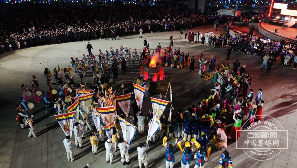 傍晚5时30分,伴随着一阵铿锵有力的锣鼓声,秧歌“会师”闹元宵率先登场。五百余名身着艳丽秧歌服的表演者踏着鼓点,扭动身姿,舞龙翻飞、红绸飘扬,迅速点燃现场节日氛围。观众席间掌声不断、喝彩连连,欢声笑语在春寒中升腾。随后,朝鲜族上元节传统民俗“火烧月亮房”如约上演。彩衣舞者头顶象帽,伴随悠扬的朝鲜族乐曲翩翩起舞,彩带飞舞、步伐轻盈,生动演绎古老民俗故事,令观众沉浸其中,感受非遗的独特魅力。